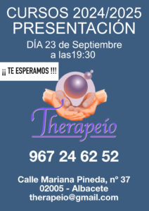 Hola Amig@s.Esperamos que vuestros días de descanso (si los habéis tenido) hayan sido satisfactorios y plenos. Con el verano llegando a su fin y la vuelta a las rutinas llamando a la puerta, volvemos para iniciar el nuevo curso 2024/2025, en THERAPEIO .Como en ediciones anteriores, comenzamos con el acto de promoción-divulgación: Presentación de los